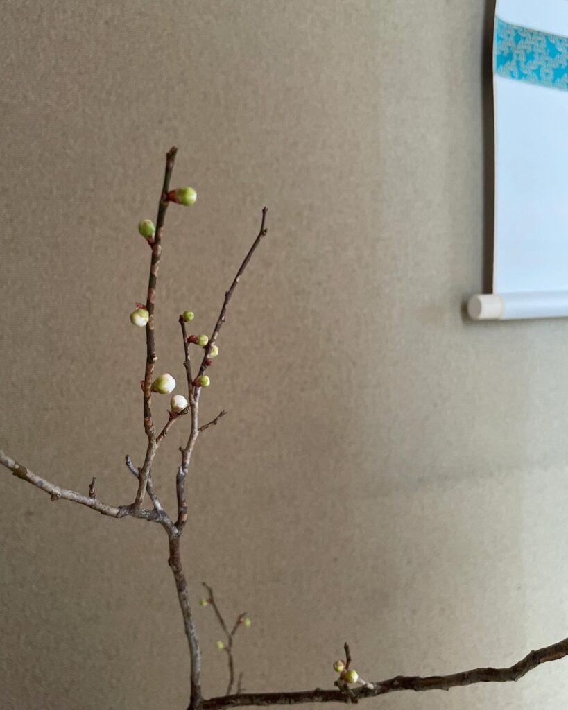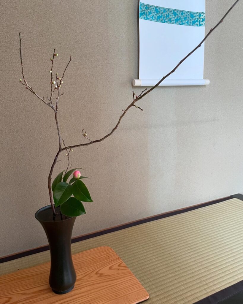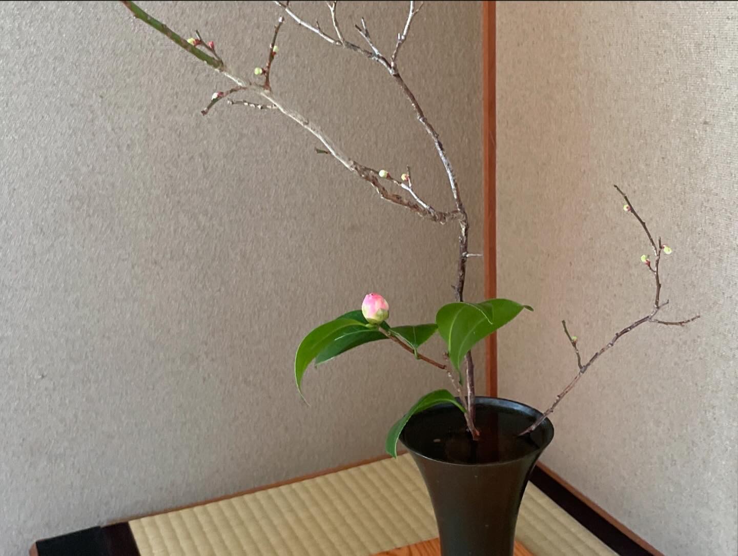 2月の床の花は梅とピンクの花が可愛らしい庭の乙女椿をいけました。