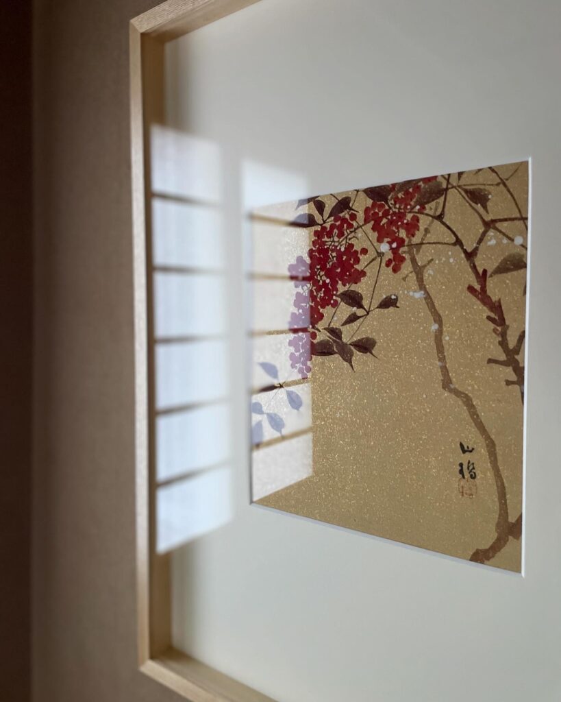 色紙は南天に雪が降っている冬を連想する日本画をかけました。