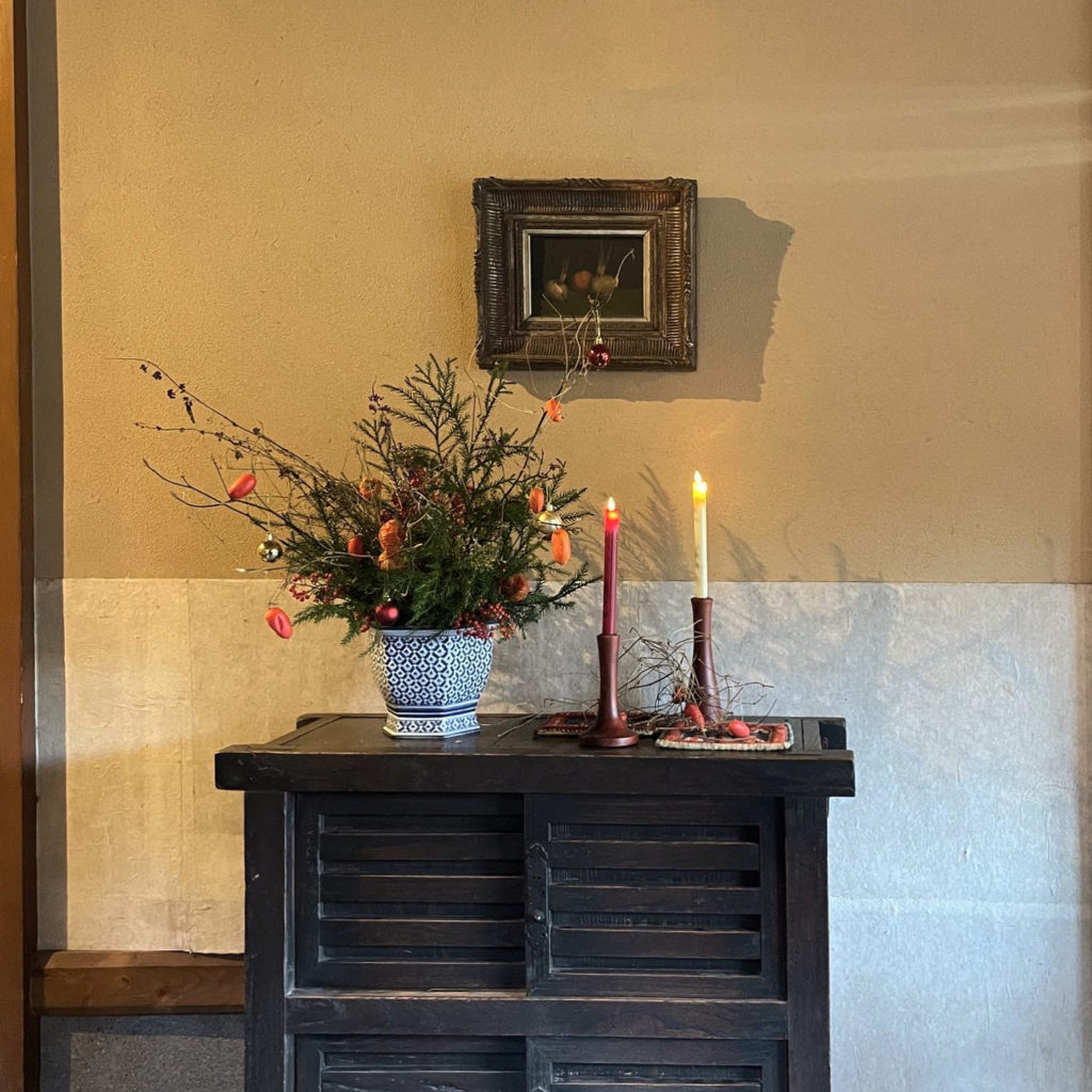 宿の室礼では、自然にある常緑樹と実物や落葉を活かした室礼師松村オリジナル『森のアレンジ』とキャンドルを組み合わせをしています。