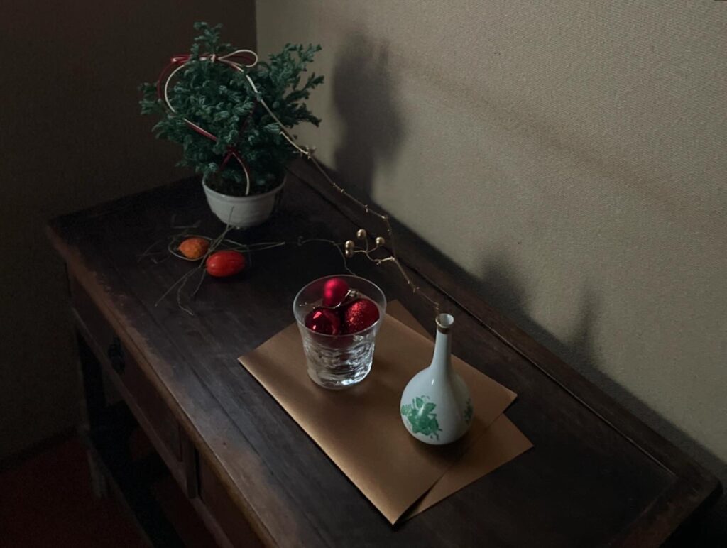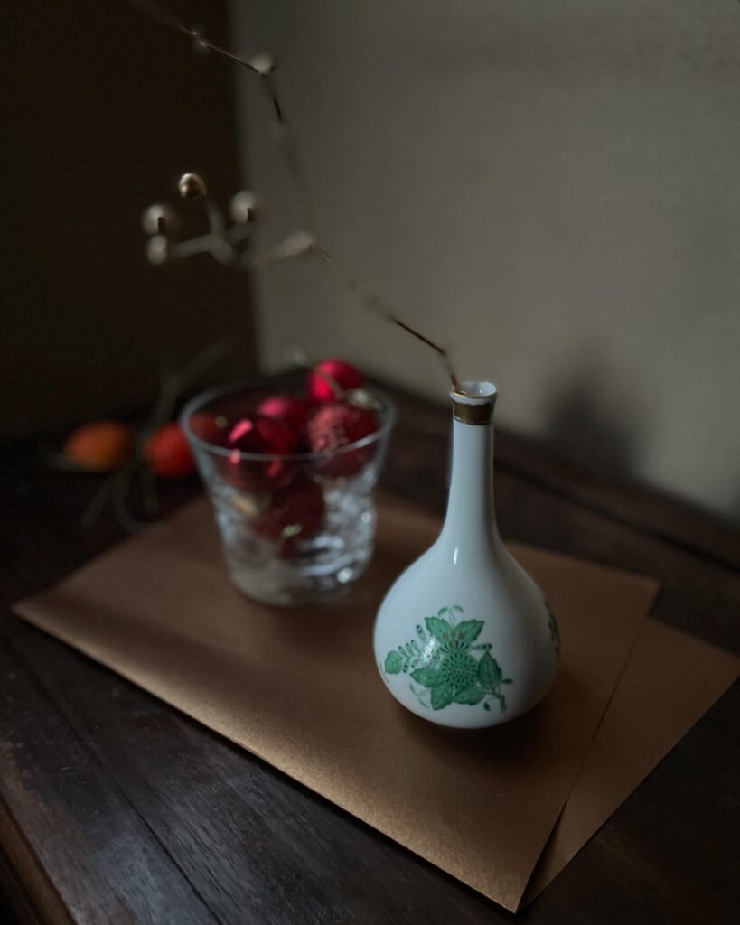 オーナメントはバカラのロックグラスに入れ、ヘレンドの一輪挿にはゴールドに色付けをされて山帰来の実を1本添えました。