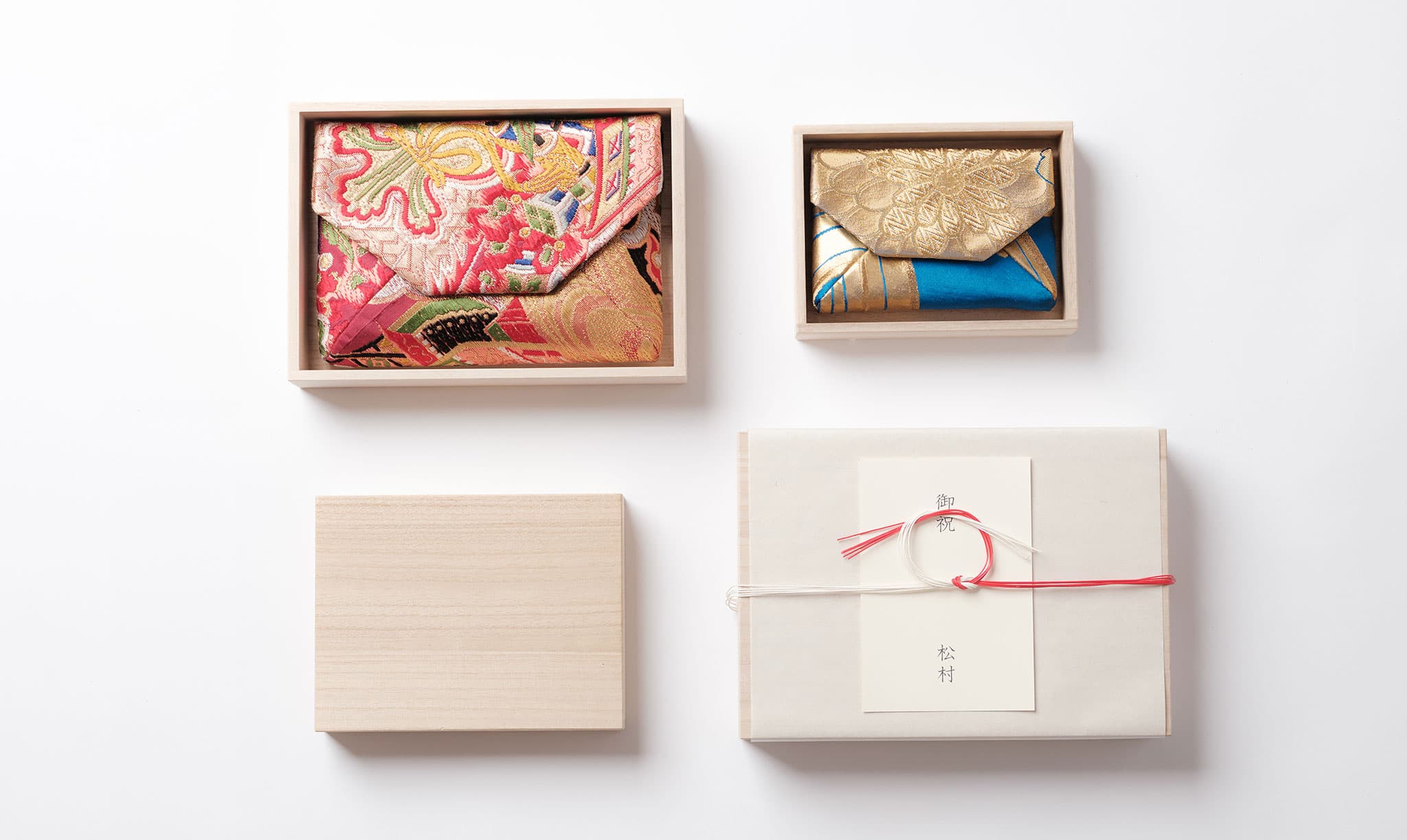オフィスエムの数寄屋袋”SUKI”は贈り物としても好評です。ジェンダーレスで使えるので、パートナーに贈って一緒に使うという方も。どのサイズも全て桐箱に入れてお渡ししているので、お世話になった方・大切な方への改まったギフトとしても最適です。