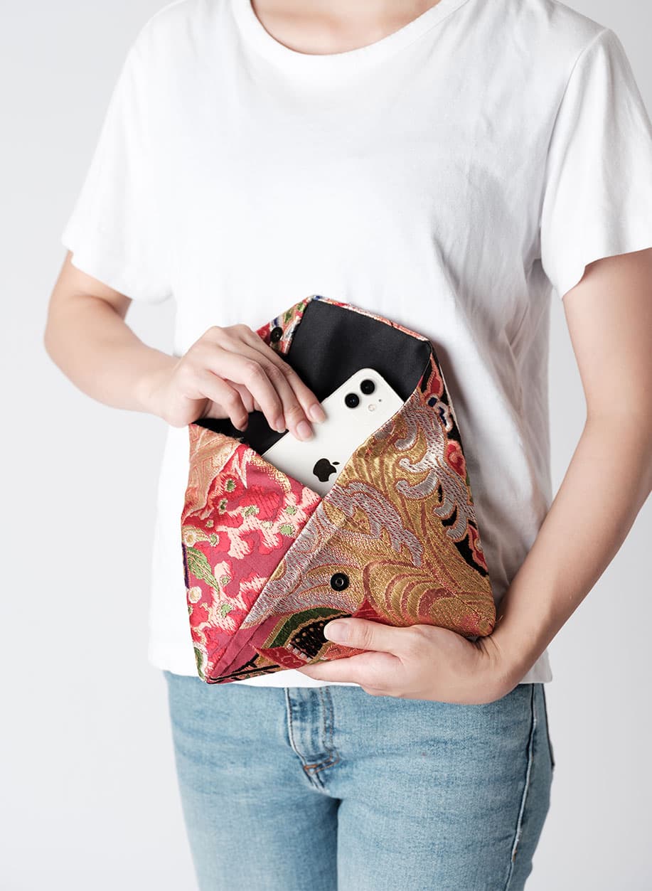 クラッチバッグとしても気軽に使えるのが数寄屋袋“SUKI”の魅力。シンプルなお洋服でも、さっと手に持つだけで普段のコーディネートをさらに魅力的に仕上げてくれます。フォーマルシーンからからタウンユースまで幅広く使える他、小物の迷子を防ぐためのバッグinバッグとしても活躍します。