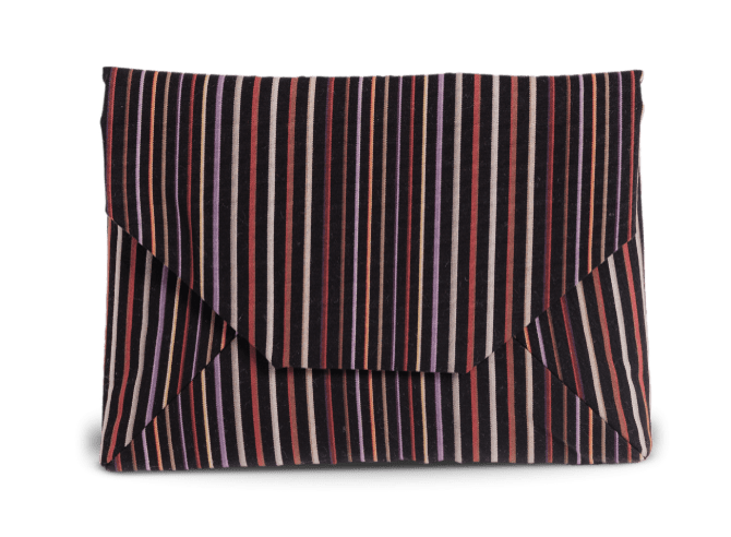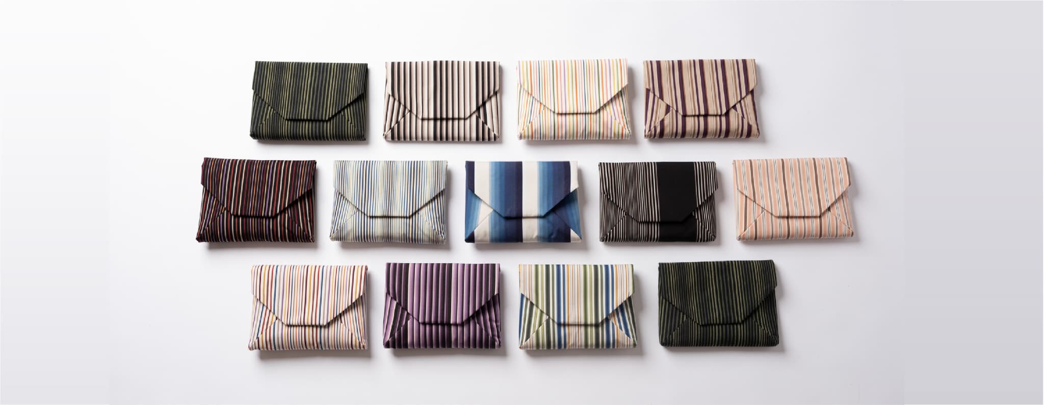 伝統的な数寄屋袋を現代のライフスタイルに合わせた“SUKI”シリーズは、めぐみ和裁工房とのコラボレーションにより誕生いたしました。オフィスエムが企画、めぐみ和裁工房が製作を監修しています。日本の縫製技術を生かした美しい直線、角が特長です。
