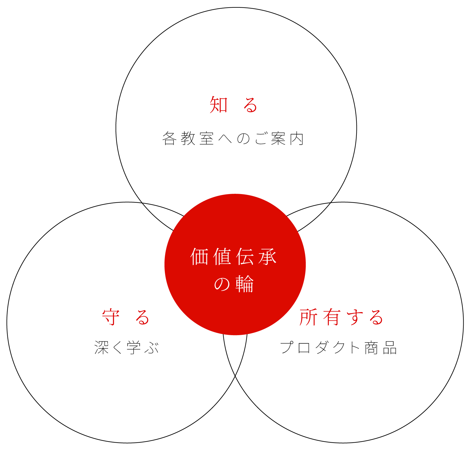 日本古来の文化を、現代の暮らしに合わせて繋いでいくこと。それを私たちは「価値伝承の環(わ)」と呼んでいます。価値は時間と共に、歴史の一部となっていきます。その一方、歴史の流れから隅に追いやられたものは、やがて忘れられ、その命を失っていきます。しかし、そこには現代人が気づいていない、歴史の一部に組み込まれるべきだった価値が眠っています。そこに新たな光を当てていき、そうしてまた関心を作り出し、後世へと引き継いでゆくこと。それが「価値伝承の環(わ)」なのです。